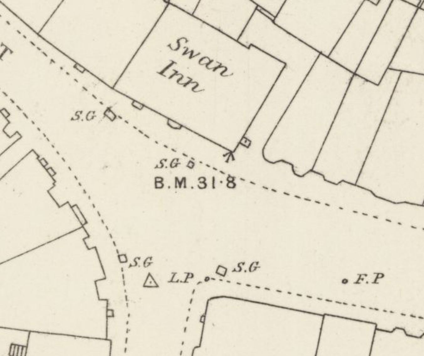This pump, however, did not last forever. I have been unable to ascertain the exact date of its removal, but it had certainly been taken down by 1886, when the Ordnance Survey town plan of Faversham was published. This map makes it clear that, by the late 19th century, neither pump nor cross existed in the centre of the road; nevertheless, the town plan does depict an un-named structure at the entrance to Hogmarket Lane, on the west side, adjoining the east wall of The Swan, which appears to be a pump. The 1907 25-inch map of Faversham, which marks a large "P" at this location, confirms that this is the case. Presumably, then, the old pump of 1574 (or later, if the 16th century pump had already been replaced) was taken down and replaced with a newer pump at the entrance to Hogmarket Lane, only a few metres from the original site of the well, at some point before the 1886. Interestingly, this places the date of the plaque's erection, assuming that it remains in situ and has not been moved from a different position, between the years of 1873 (when the idea that the well was dedicated to St Crispin was first postulated) and 1886 (by which time the pump had moved from in front of The Swan, to beside it), as the plaque appears to refer to a pump situated directly in front of the pub.
