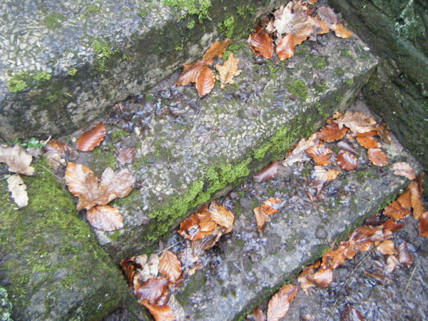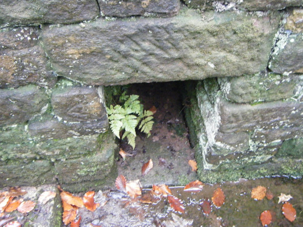 When I visited the site in November 2024, I found that the substantial structure housing the spring was in remarkably good condition. A set of steps, the original versions of some of which had evidently been replaced by concrete, led down to the water, which issued into a very silted-up stone basin, only the top few centimetres of which could be seen. There was an intriguing stone-lined cavity, perhaps half a metre deep, in the eastern face of the structure, which may perhaps once have housed offerings. More interesting than that, however, was a large stone shield, blank, and built into the wall just above it and to the right; if this once bore a coat of arms, then it this had worn off completely by the time of my visit. It is not clear at all how old this entire structure is, but the inclusion of the mysterious alcove and the coat of arms suggests that it is at least several centuries in age.