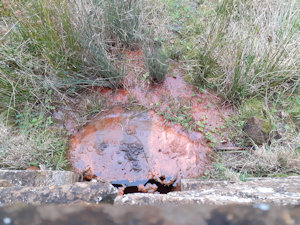 St Botolph's Well itself, likely dating from the time of St Botolph's visit to the parish, has been mentioned by several historians over time, although it has mostly been mentioned in passing, and usually as part of a longer subsection about Farnborough Hall, the well having been inclosed in the grounds of it for the last few centuries or so. The site has rarely been afforded more than a short sentence - if that - and it seems that the only notable feature about the well that the majority of historians could find to mention is the fact that it is a chalybeate spring, meaning that the water contains a high concentration of iron. As a result of this, the rock in front of the well is stained orange, as can be seen in the images below. In fact, the unusual red colour of the water was at one time said to be caused by rust from the nails of the cross. William Smith, in A New and Compendious History of the County of Warwick (1830), expressed his disdain for the well: