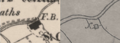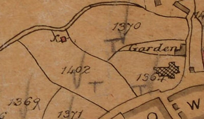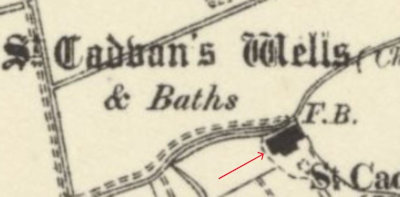 After studying several old maps, I personally think that two different bath-houses have been built on the site. A square building set in a small enclosure is shown on a tithe map from 1841 and, despite its looks, it appears that this was a bath house, as an Ordnance Survey map of 1834, which subsequently predates the tithe map, shows a similar small building to the west of the church, labelled as "Baths". This structure that is shown in the tithe map certainly is the well, a fact that is proven by the name of the field in which the structure is located: "Well Meadow". However, by the 1880s, the shape of the building has changed from a square to the present T-shape; from this point onwards, the building is named as "St Cadvan's Wells", in the Gothic script.