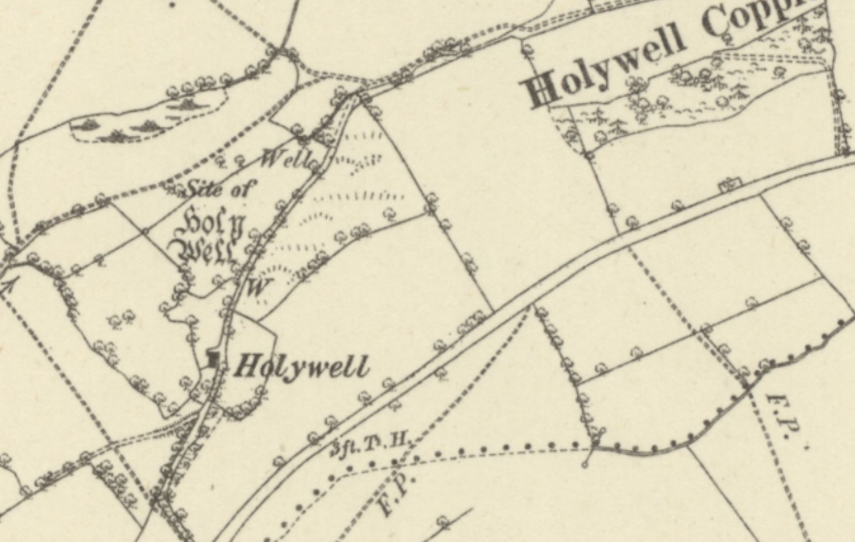 In fact, comparatively few records of the well exist at all, and the earliest reference that I have found to it dates from 1841, when the parish tithe schedule, which mentions a number of plots of land nearby that contain "Hollywell" [sic] within their names, was drawn up. Perhaps most notable are a group of fields all named "Hollywell Meadow", although the name of a small cottage located near the well is also recorded as "Hollywell Cottage and Garden", the words "Holly Well" appearing next to it on the tithe map itself. What is particularly interesting is the fact that "Hollywell" appears to have been regarded (at least by the 1840s) as a place or area in its own right, because the apportionment reports on several pieces of land, none of which are located particularly close to the Holy Well, with names such as "Land near Hollywell" and "Field near Building at Hollywell". It is also interesting to note that the field in which the Holy Well is situated, assuming that the location given for it by historic Ordnance Survey maps[8] is accurate, is called "The Bank", a name which, unlike those of other fields in the vicinity, bears no reference to the site.[9] This suggests that either the location provided by historic OS maps is inaccurate, or perhaps that the well had lost most of its importance by the 1840s, its name then being applied to the area as a whole, causing nearby fields to take on its title, albeit in the slightly garbled form "Holly Well".