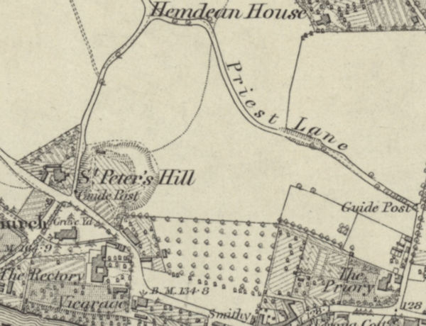 Unfortunately, the exact location of St Ann's Well cannot be stated for certain, simply because of a lack of historical documentation, but place-names that corroborate with Loveday's description indicate the vague area that the well must have been located within. "Priest-lane" was named and marked on first edition Ordnance Survey maps, published in the latter half of the 19th century. The name later morphed into "Priest Hill", the title that the road retains to this day. Although I have no access to tithe map records for this area, the field named "The Mount" was almost certainly the large field once located directly south of Priest Lane; this is indicated by the presence of a neighbouring lane called "The Mount" that ran along the western edge of this enclosure. If Loveday is to be believed, then the well must have been located somewhere along the southern boundary of Priest Lane. To complicate the situation further, the name "St Anne's Road" is something of a red herring, as it was only built in the last century.