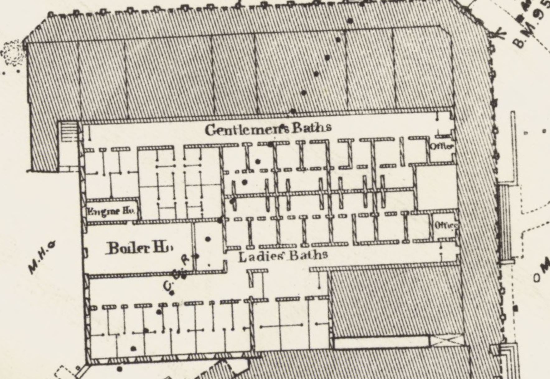 By the early 19th century, a multitude of baths existed in Buxton, all of which were reputed to be good for curing different ailments. On the eastern end of the Crescent were the hot baths (as just described), whilst the western end was home to a set of cold baths, which were termed the "natural baths". There were five, according to a certain Dr Scudamore, writing in 1839, of these "natural" baths: three for "gentlemen", and two for "ladies". In addition, Scudamore attested that there was a "vapor bath", several "well-constructed shower baths", "an excellent plunging bath of the temperature of 60°", the two "charity baths", and the "large bath", which was reputedly located directly over the spring.
