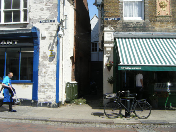 Just like its predecessor, this new pump was eventually removed, although the date of its removal appears to have been very recent, as I discovered when I visited Faversham for myself in August 2025. Inquiring about "St Crispin's Well" at the town hall, I was surprised to find that, locally, the name was well-known, as well as its location. Although I was initially informed that the well "is behind the butcher's", the butcher himself did not know anything about the site, had never heard of it before, and confirmed that there was nothing at all "behind" the building; there was, nevertheless, an alleyway (Hogmarket Lane) at the side. Returning to the town hall, a helpful volunteer offered to take me to the well itself: however, arriving at Hogmarket Lane, he was shocked to find that "the pump" had vanished. A passing local, who also knew of "St Crispin's Well", stopped to help, and, after confidently asserting that there was a pump somewhere in the alley, was also amazed to find that it had disappeared.