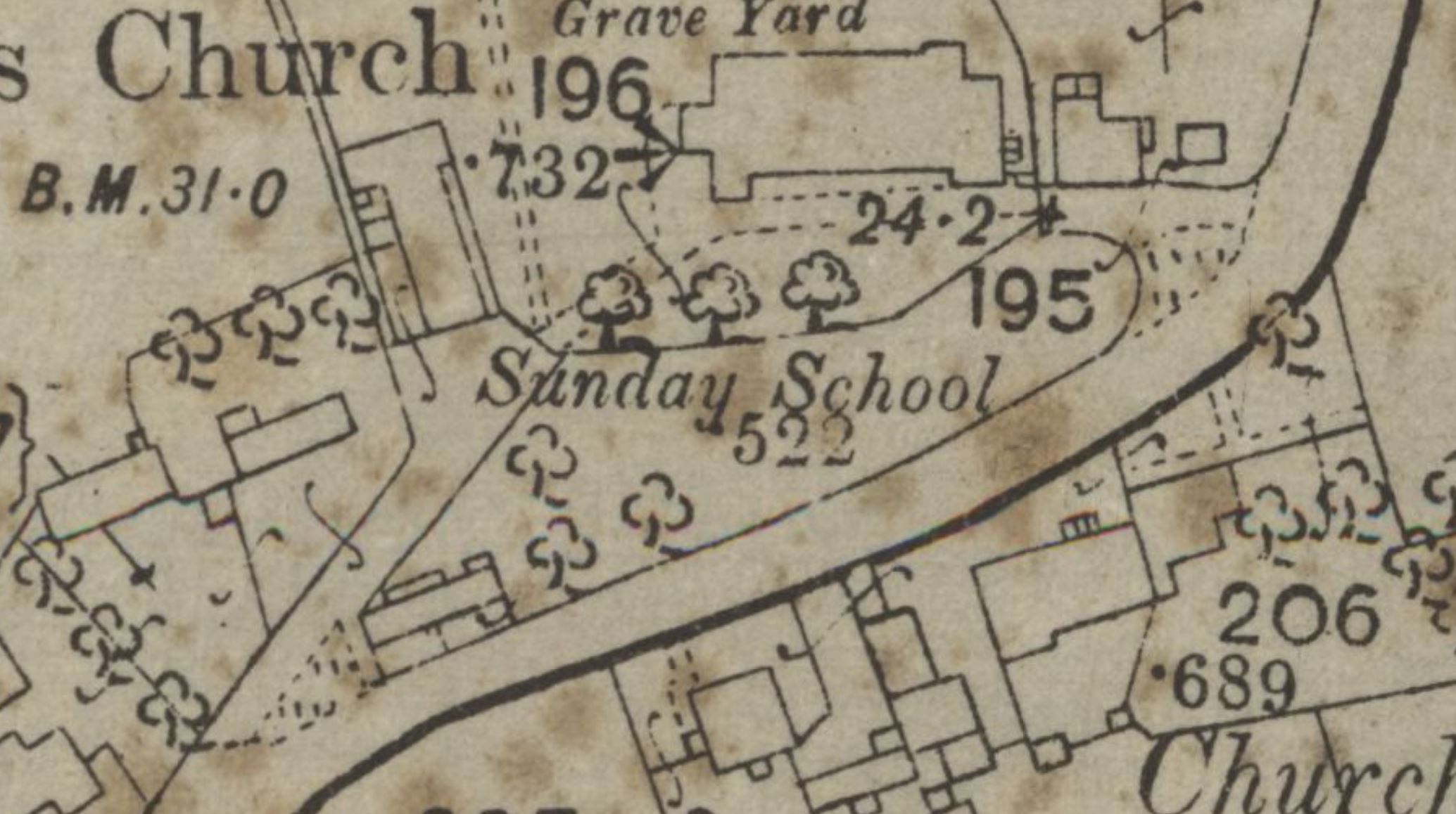 According to the Historic Environment Record, the Holy Well was filled in "when the churchyard was extended", but was "re-discovered in 1935 by the sexton", whilst he was digging a grave at roughly "SD 31884053". For once, the database may actually be correct: the 1892 25-inch OS map of the area depicts what appears to be a garden, separate from the churchyard, between the church and All Hallows' Road; in the west of this garden is a small building that may well have been a cottage. This is also shown on the slightly later 1895 6-inch OS map, although the building had clearly been demolished by 1912, and later maps show this garden area as being a part of the churchyard, as it remains today. Evidently, the cottage and garden were destroyed in order to enlarge the churchyard. Intriguingly, the grid reference provided by the Historic Environment Record, SD31884053, does place the well within the bounds of this garden, so it is likely correct. It is worth noting that although no historic Ordnance Survey maps mark a well or spring at this location, that is not to say that one did not exist there, as OS surveyors regularly failed to find holy wells, or mark them on the map, particularly if there was a lack of available space.