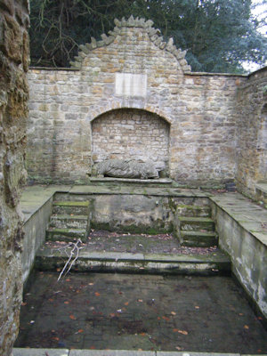 Probably in the early 19th century, or the late 18th, this older "summer-house" was replaced, or at least remodelled (it is quite possible that the main fabric of the baths remain unchanged). What makes this clear is not in fact documentary evidence, but one of the many inscriptions that can be seen on the walls of the bath-house. This particular inscription is situated directly opposite the doorway, above a large recumbent stone figure, and it is a verse taken directly from one of the poems of Thomas Warton, who became the Poet Laureate in 1785. He died in 1790, and it is probably after this date that the inscription was added to the bathing house. This inscription was transcribed and translated in 1896 in Rushton and its Owners: