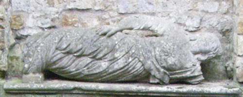 This clearly refers to the large recumbent stone figure beneath it, indicating that the statue was deliberately made into a feature of the bath-house when it was remodelled. However, this figure clearly was not originally made for the bath-house, and it seems to be much older than it, as it is missing its left arm. Interestingly, the discovery of several stone figures near the bath-house was mentioned in Rushton and its Owners: