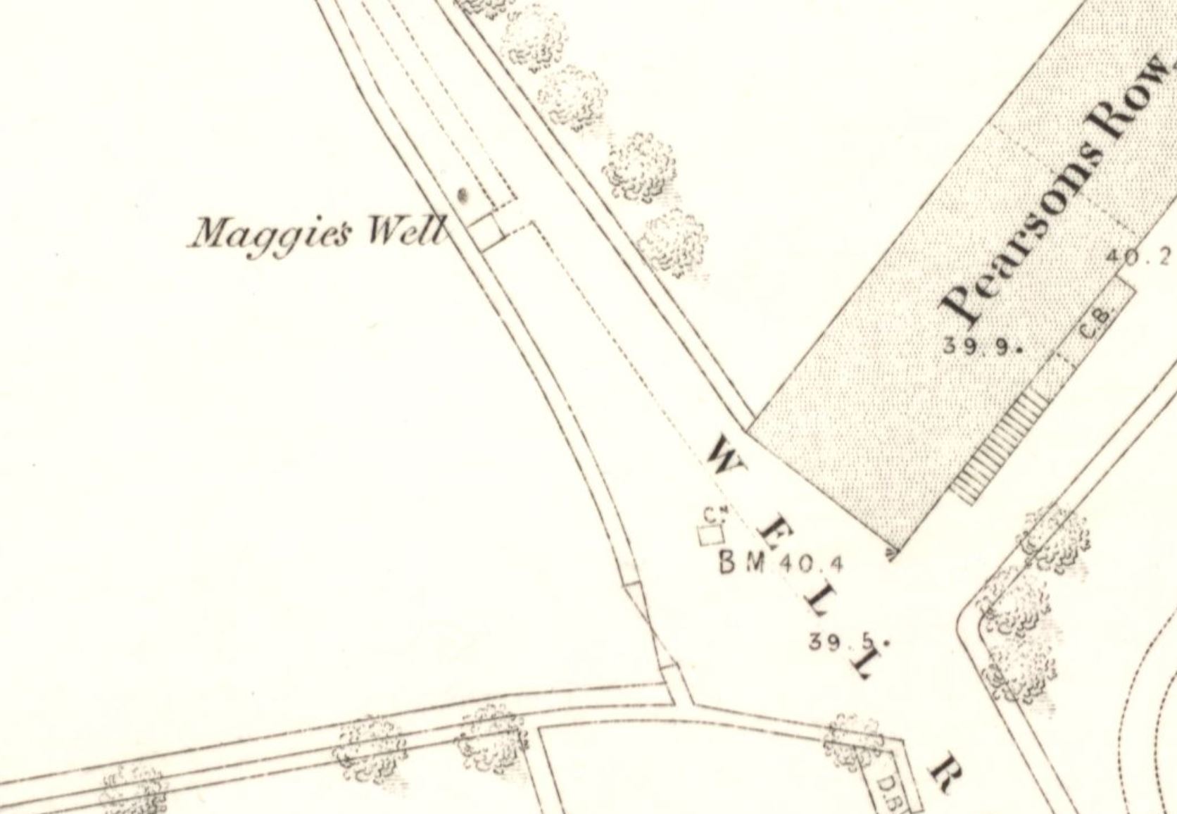 This spring was first marked on the OS town plan of Tweedmouth, published in 1855, only two years after Johnston's book was published, as "Maggie's Well". According to both this and later maps, Maggie's Well was located at the side of a small lane called "Well Road", the north end of which adjoined "Well Square"; as there are no other wells or water sources marked on OS maps in the vicinity, these places must take their names from the existence of this spring, suggesting that it was once of local importance. The site continued to be marked and named on Ordnance Survey maps until 1938, after which time the location of Maggie's Well was only denoted by a "W". It had evidently fallen out of regular use by the 1960s, and was presumably filled in around that time, as it ceased to be marked on Ordnance Survey maps from then onwards. I have been unable to find any information regarding Maggie's Well, including the origin of its name, apart from the fact that it was marked on historic OS maps.