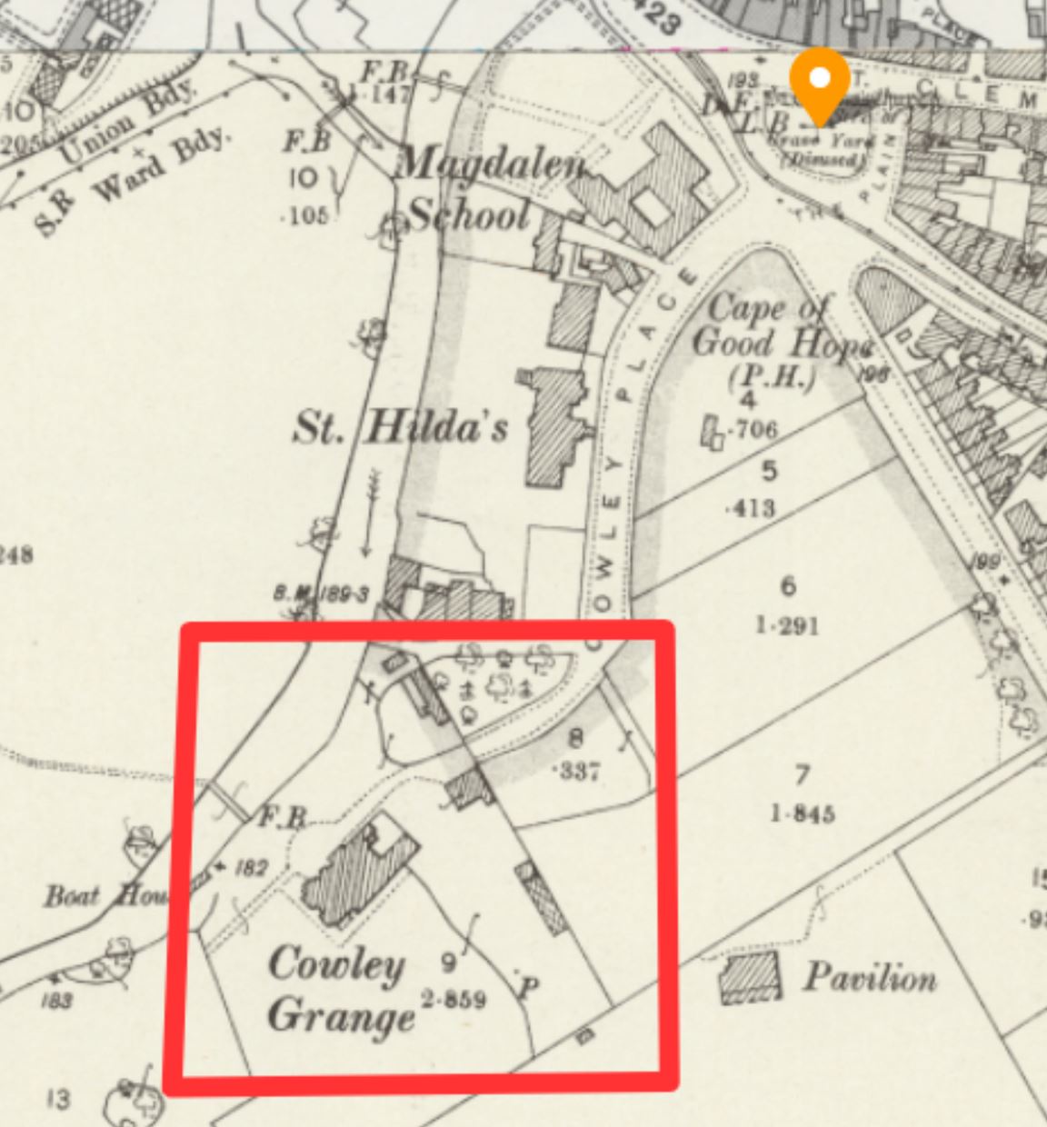 The 1886 OS map of the area marks "Mill Ford" at SP5213405853, just south west of what is now St Hilda's College; it is surely no coincidence that this ford was located approximately a furlong south west of the original site of St Clement's Church. This suggests that the holy well was located on the eastern side of the River Cherwell, just south of St Hilda's, which is corroborated by the fact that this would place the site both within the parish of St Clements, and on the edge of "St Edmund's Well Furling". Old Ordnance Survey maps, of course, do not mark any springs or wells in this area, which is no surprise given what is said to have happened to the site. Rather oddly, James Ingram, writing in Memorials of Oxford in 1837, described a "well of good spring water" at this location, which he claimed was known as St Edmund's Well, and was "never known to fail in the dryest season"; Ingram was probably incorrect in his claims, which contradict all other sources that I have come across.