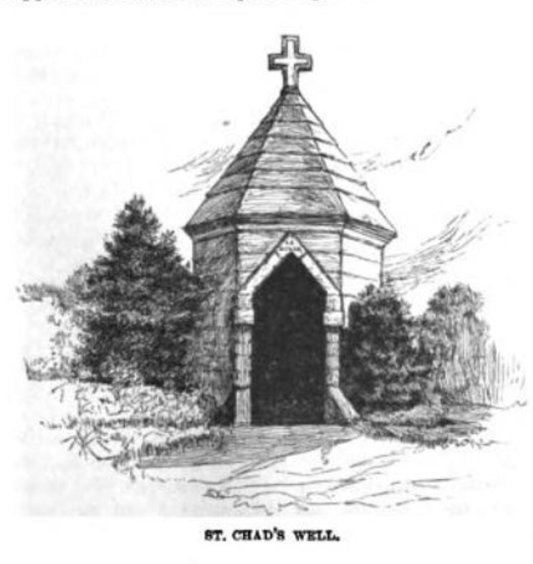 There is a ſo a VVell neere to the ſame Church [the "Cathedrall"], commonly called S. Chads VVell; In the bottome whereof, lieth, vntill this day, a cleere greate marble ſtone, whereon S. Chad was wont to kneele and pray in his Oratory; the water of which Well, is very wholſome & ſoueraigne for many diſeaſes. |