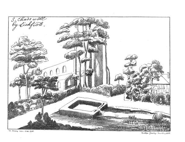 But of all the English wells, scarcely excepting Rosamond's, the most notable is that of St. Chad, near Dr. Johnson's town of Lichfield, and at Stowe Church. It remains in some gardens adjoining the west end of that building. The water is sulphurated, and close to it is a pretty iron pump, giving water from a second well, which is superfine chalybeate. At the bottom of the steps leading to St. Chad's Well, and in the middle of the water, is a stone on which, some say, St. Chad was accustomed to stand and pray. |