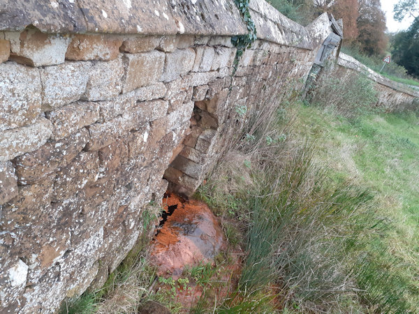 St Botolph's Well itself, likely dating from the time of St Botolph's visit to the parish, has been mentioned by several historians over time, although it has mostly been mentioned in passing, and usually as part of a longer subsection about Farnborough Hall, the well having been inclosed in the grounds of it for the last few centuries or so. The site has rarely been afforded more than a short sentence - if that - and it seems that the only notable feature about the well that the majority of historians could find to mention is the fact that it is a chalybeate spring, meaning that the water contains a high concentration of iron. As a result of this, the rock in front of the well is stained orange, as can be seen in the images below. In fact, the unusual red colour of the water was at one time said to be caused by rust from the nails of the cross. William Smith, in A New and Compendious History of the County of Warwick (1830), expressed his disdain for the well: