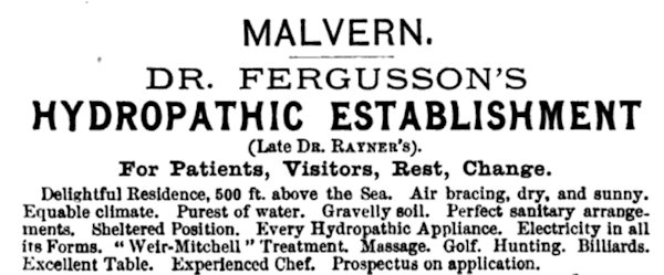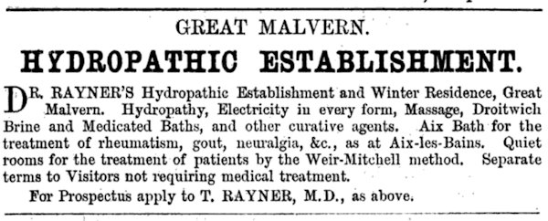 In the 19th century, the concept of the "Malvern Water Cure" became more popular seemingly than ever before. Accounts of "patients" from the time, such as that of Edwin Paxton Hood, who published a series of letters that he had written during his time as a "patient" in Records of a Water Patient in Malvern, show that several different competing "hydropathic establishments" existed in Malvern simultaneously, each one under the supervision of a different doctor who specialised in the Water Cure. Among these countless "establishments" were Rayner's Hydropathic, Leicester House Hydropathic (which cost 42 shillings a week), and Townsend House. Most "patients" were upper class men and women who stayed in Malvern for long periods of time, enduring a range of mostly unpleasant "treatments".