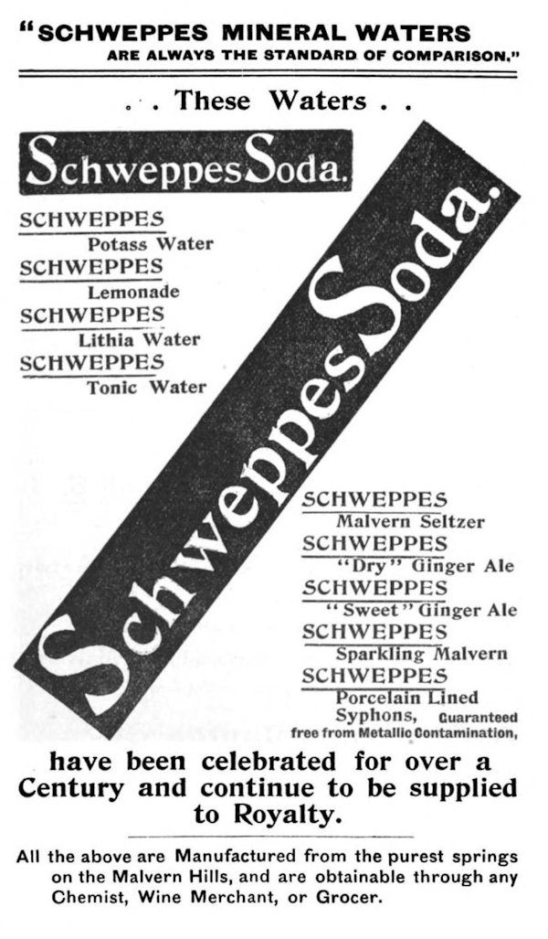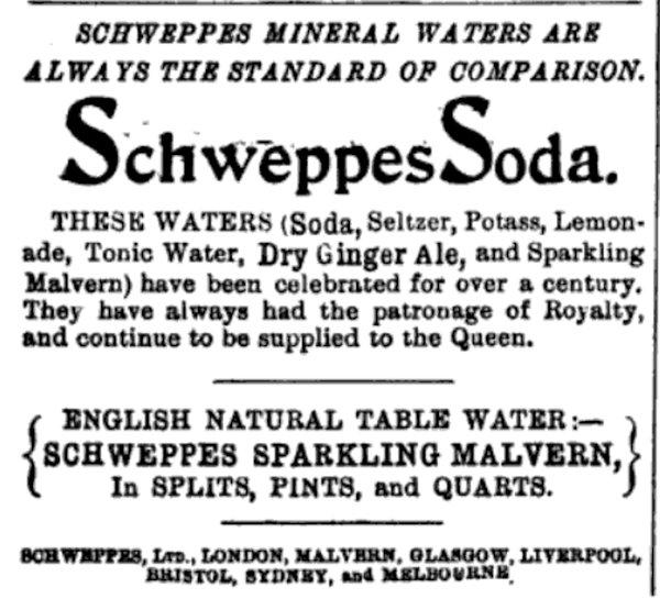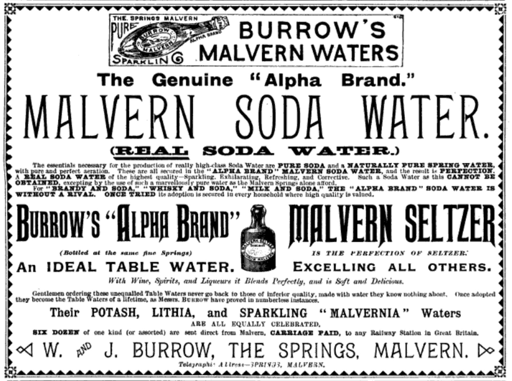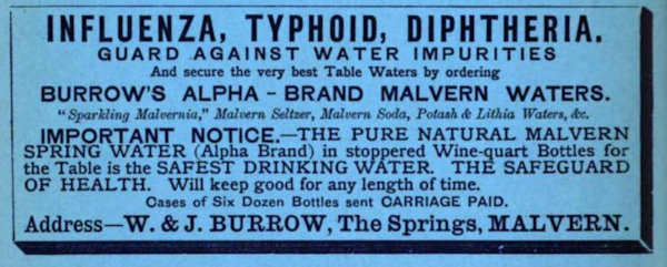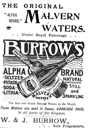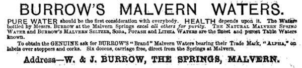 Several different companies have, in times past, bottled water at the Holy Well, including Schweppes, that famous soft drinks brand, which began bottling the "holy water" in 1850, initially branding it "Malvern Soda", and later re-branding it as "Malvern Seltzer Water". Another prominent bottling company, whose adverts appear in multiple Victorian magazines, was Burrows, who distributed Malvern Water across the country. I have found several of their adverts (as well as some from Schweppes), and they can be seen below: