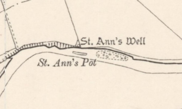 I have thus far been unable to find any historical references to St Ann's Well, apart from its inclusion on Ordnance Survey maps. It appears to be one of those holy wells that has been unlucky enough to have had nothing recorded of its history. It has long been named on OS maps, however, and, until around 1930 or so, a "St Ann's Pot" was marked near it. It is very likely that this took the form of some sort of pool that could be used for bathing.