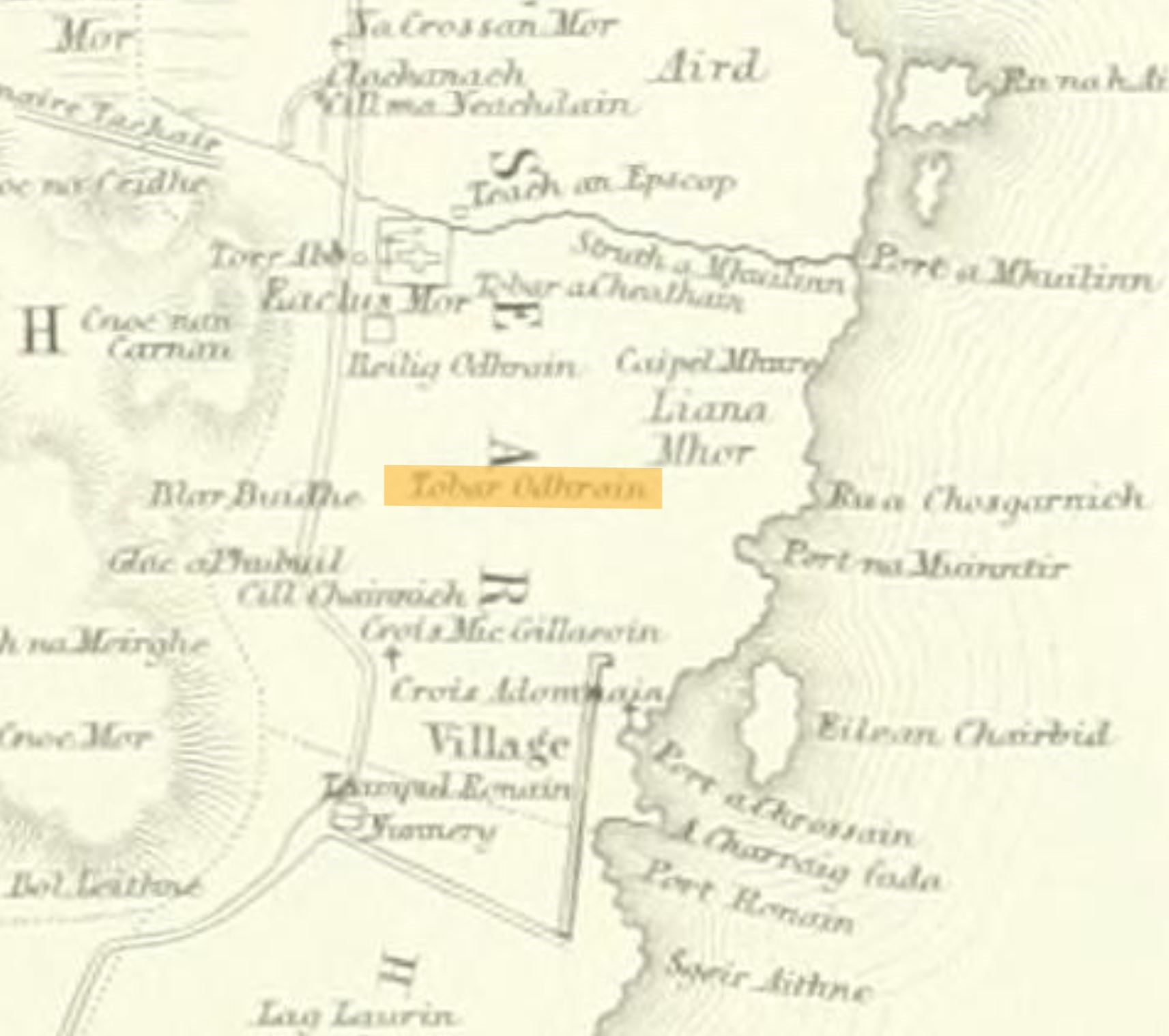In fact, the only documentary reference to the site's existence that I have been able to find dates from 1857, when William Reeves mentioned it in Vita Sancti Columbae. He called it "Tobhar Odhrain", and stated that it is located "a little east of the Free Church manse", but said nothing of its history, or even of its association with St Oran. It is Reeves' map of the island, however, which was included in the same publication, that is really useful in pinpointing (albeit not exactly) the location of the well. Below is a very poor image of the part of the map that depicts the well, with the title "Tobar Odhrain" highlighted:
