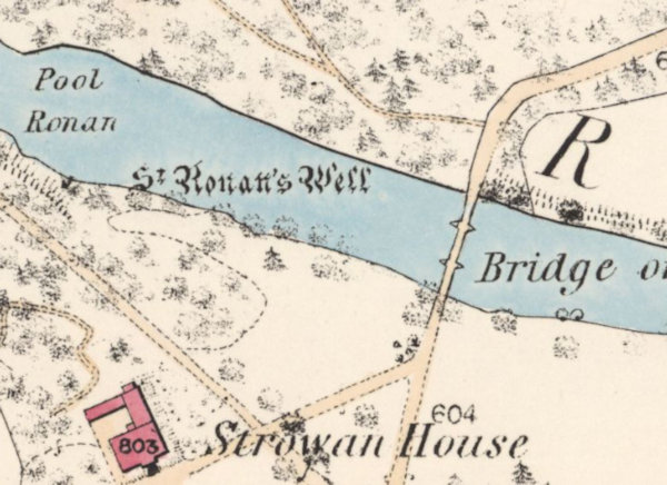 Very little information about the well itself has ever been recorded. It certainly had a direct link to the local cult of St Ronan, cemented by the fact that the well is located in the grounds of Strowan House. According to the Rev. Arthur Gordon, writing in Chronicles of Strathearn, in 1896, the well "never failed to supply" St Ronan "with fish on Fridays"; what truth there is in this statement is slightly questionable. I have, unfortunately, not come across records of any traditions that were associated with the well (although there almost certainly once would have been). There is, however, something that may hint at a history of bathing at the site: the existence of a deep pool of water in the neighbouring River Earn called "Pol-Ronan", or "Ronan's Pool", (it can be seen on the above Ordnance Survey map) which could have been used as a natural bathing pool.
