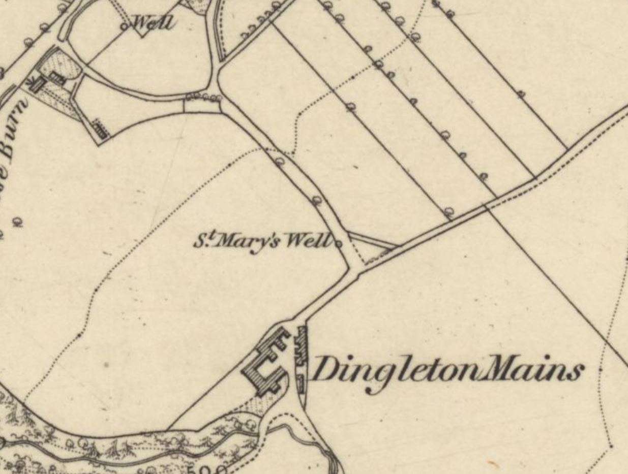 In fact, only historic Ordnance Survey maps provide the location of St Mary's Well, which has been marked and named at NT5468033340 on every OS map published of the area. It is interesting to note that the 1863 6-inch OS map of Dingleton depicts what appears to be a small road or track running south past St Mary's Well, to Dingleton Mains, the farm on which this particular spring is located. This is confirmed, a century later, by the 1964 OS map, which describes this as a "track", named, according to the 1898 25-inch, "Dingleton Loan".