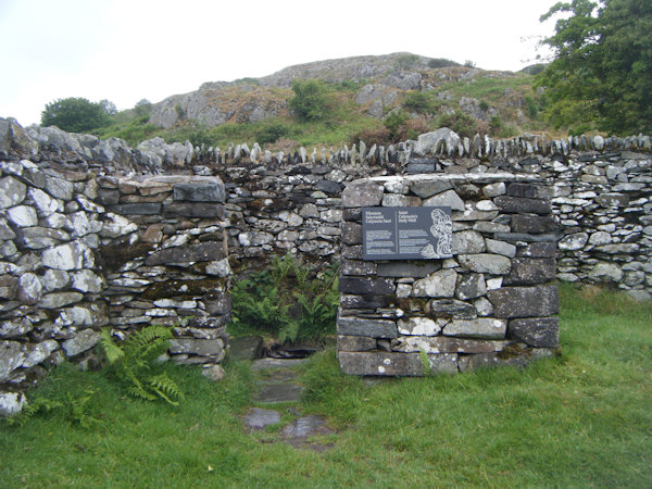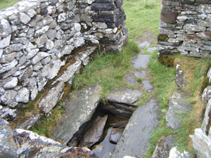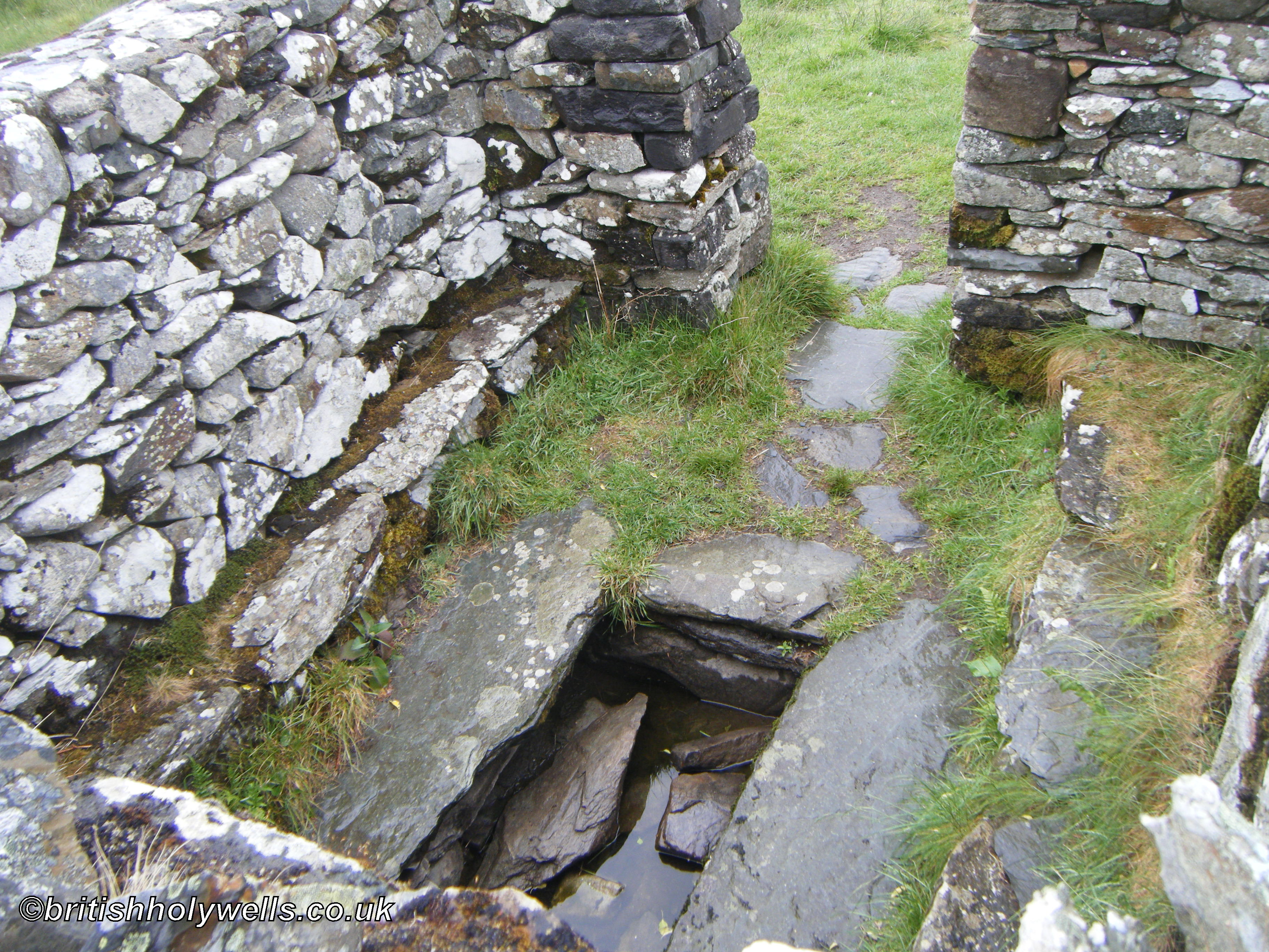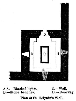 In a piece published in Archaeologia Cambrensis in the January of 1867, entitled Llangelynin Old Church, Caernarfonshire, Elias Owen claimed that there were once four "crevices", measuring "a few inches in breadth externally, but very much broader within", in the walls of this well-house: one "above the doorway", and one in each of the building's walls, two of which were, by then, "filled with stones". It is probable that these indents in the walls were used by medieval pilgrims to deposit offerings; structures of a similar description can be seen at the Holy Well at Pilleth, Radnorshire, and at Ffynnon Drillo, at Llandrillo yn Rhos in Denbighshire. Owen's description was accompanied by a plan of the structure, with the filled in "crevices" labelled with the letter "A":