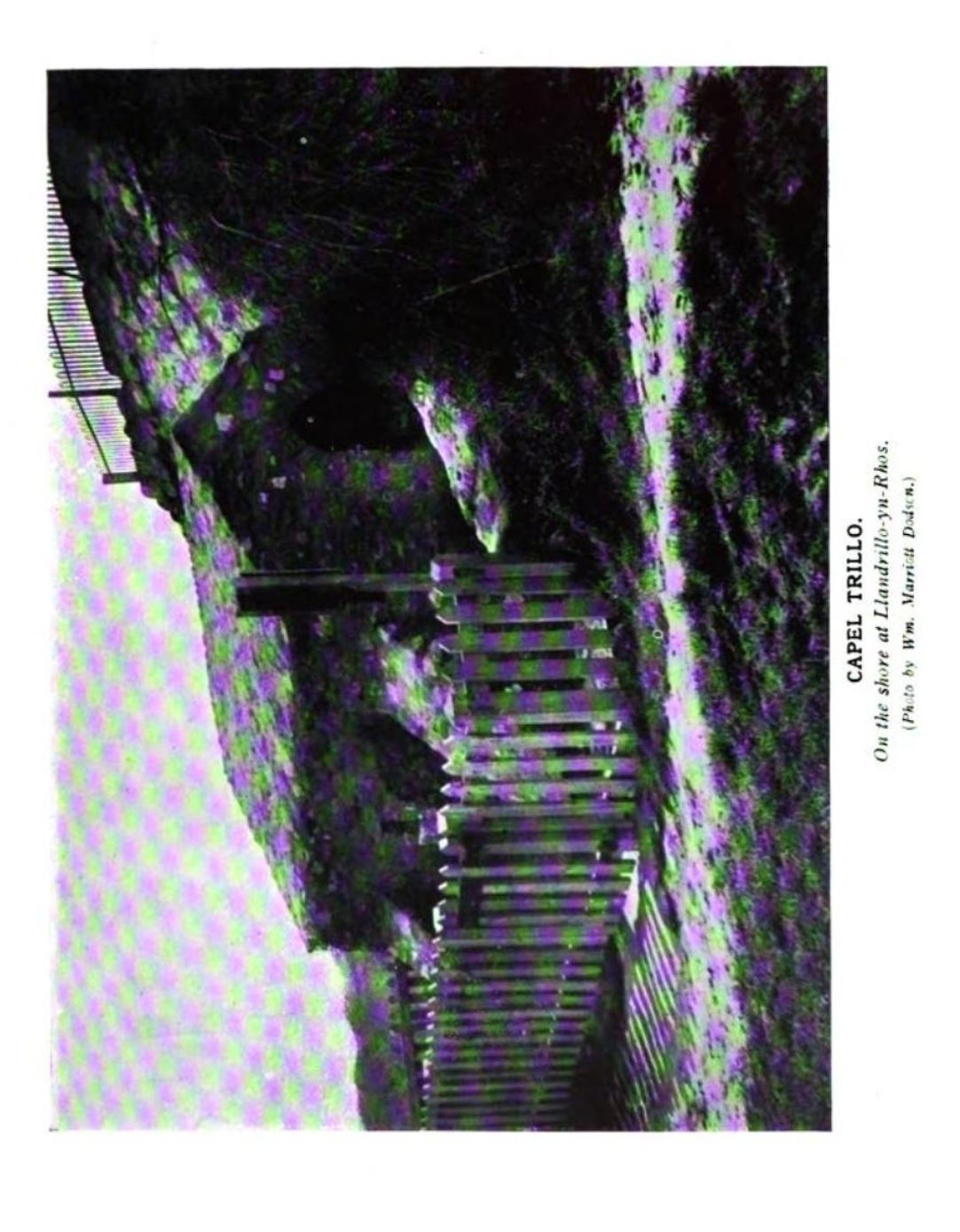 It stands, or rather as much as remains of it, close to the shore, opposite the weir, in the parish of Llandrillo yn Rhos. I was sorry to find that the vaulted roof had fallen in, that the well inside the chapel was covered over with the débris from the roof, and that the whole structure and its surroundings presented a ruinated and uncared for aspect. |