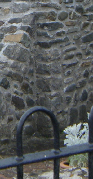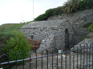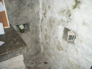 The building is not more than eight feet high to the crown of the vault internally, and it is vaulted over in rough stones; most of them, like those of the walls, being nothing but boulders from the shore, wedged and mortared in so as to form the segment of a circle inside, though on the outside they rise into a low ridge, now much damaged and overgrown with weeds. It is lighted by three small square-headed loops, without any ashlar stone work or ornament of any kind. The doorway is broken through, but it appears to have been arched over - whether in a pointed or in a circular form, it is impossible to conjecture. The eastern loop has been repaired in the head with wood and brick internally; and by its side, as well as in the southern wall, are two small square holes, probably intended to contain articles of devotion, or of use, for the frequenters of the holy well. |