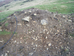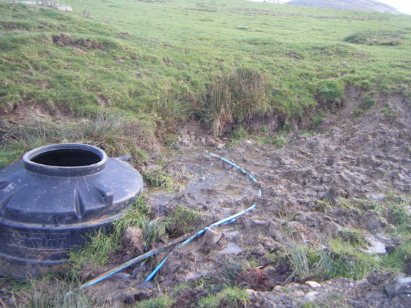 When I visited the well in late November 2024, it was little more than a spring. A large pile of dirt and rubble was heaped next to the well, and the area surrounding the spring looked as though it had been recently dug out; if there ever was a structure surrounding the spring, then this was likely the remains of it. As can be seen in the image above, a large plastic cistern had been buried into the mud next to the spring and seemed to be collecting the water, although when I looked inside it appeared to be quite green. From the site's appearance, the work was very recent, and was not complete: there were to be seen a number of seemingly spontaneously placed wires surrounding the spring. Despite the disruption, the spring was producing a large quantity of clear water that issued down the hill.
