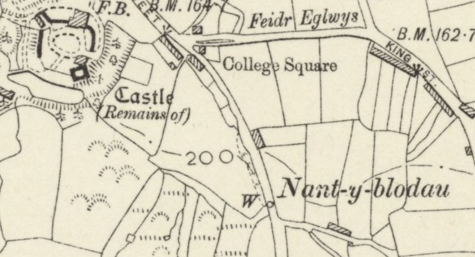 Despite the fact that the well and its undoubtedly associated well-chapel were clearly of local importance in the medieval era, the site is very badly documented. In fact, the earliest mention that I have come across of Ffynnon Gurig itself takes the form of the Royal Commission's early 20th century notes regarding the parish. They visited the well on the 10th of July, 1914, and reported that it "is situated to the south-east of the castle", but that "no traditions could be gathered concerning it". Historic Ordnance Survey maps (like the one above) suggest that the well was located either beside or directly in the middle of a trackway or road; presumably when this was tarmacked over, Ffynnon Gurig was covered by the road surface. The site was still marked on Ordnance Survey maps as late as 1948, so it must have been covered some time after that.