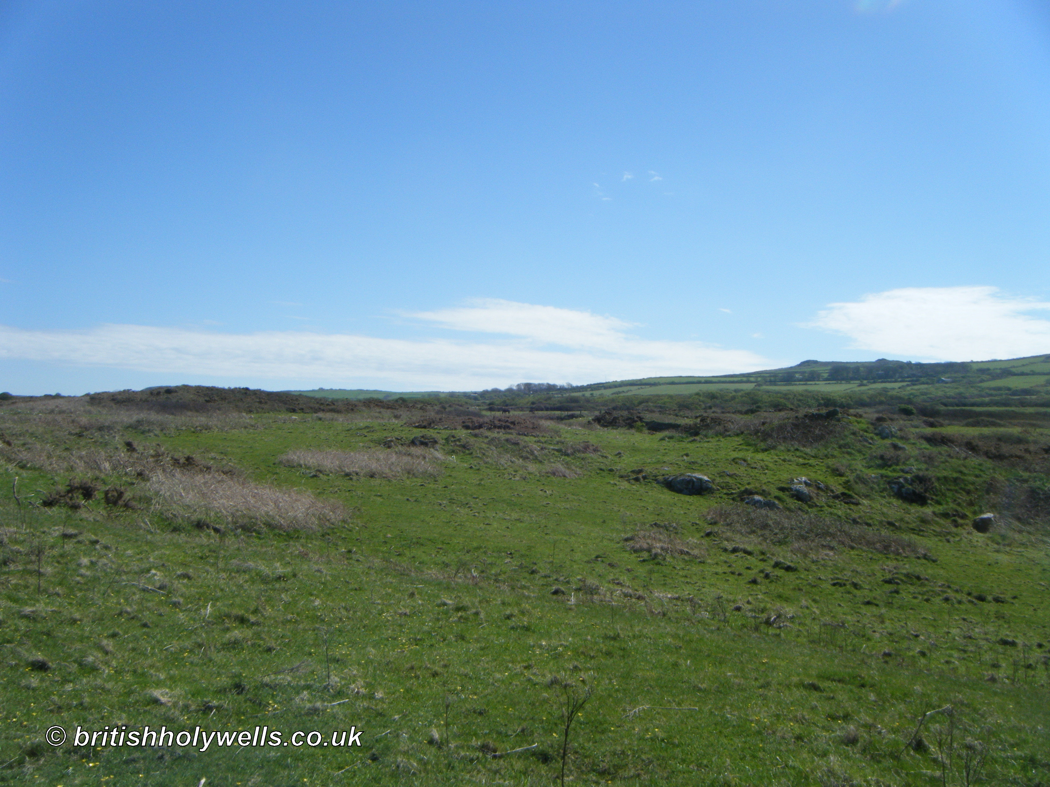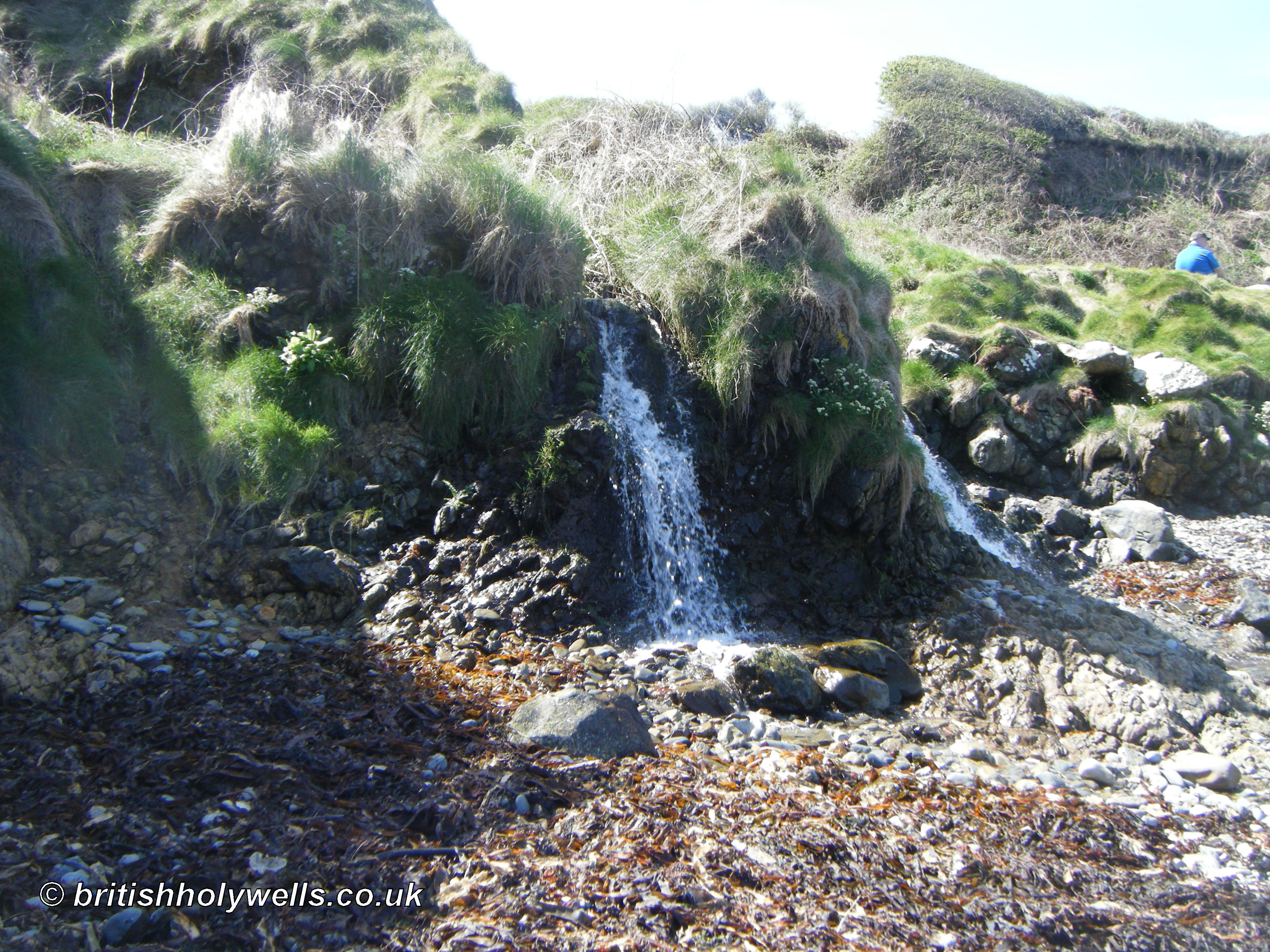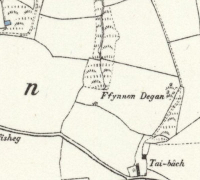 The spring that historic Ordnance Survey maps name as the well, half a mile south of the chapel, is certainly the correct site, and it is at the location that is given by the Coflein database (which incorrectly names the well after St Degfan, a completely different saint). Of course, as this spring does not fit Goff's description, and as the Coflein database is so unreliable, the accuracy of this has been called into question. However, there is much evidence to prove that this spring is the true holy well. Firstly, the name of the field within which the spring is located is called "Werglawdd Degen", which evidently contains the name of the saint; none of the surrounding fields are named after Degan, so this field must have had special significance - probably because it contained the holy well. Secondly, a footpath still survives that connects, albeit slightly indirectly, the site of the chapel and the well. Additionally, the robe of St Degan was probably moved to Tai-Bach Farm after the Reformation, which establishes another link to Degan's cult. Yet another piece of evidence is found in the name of the point at which the stream (reportedly known as "Nant Degan") that is fed by this spring reaches the sea: Aber Degan, or "Degan's estuary".