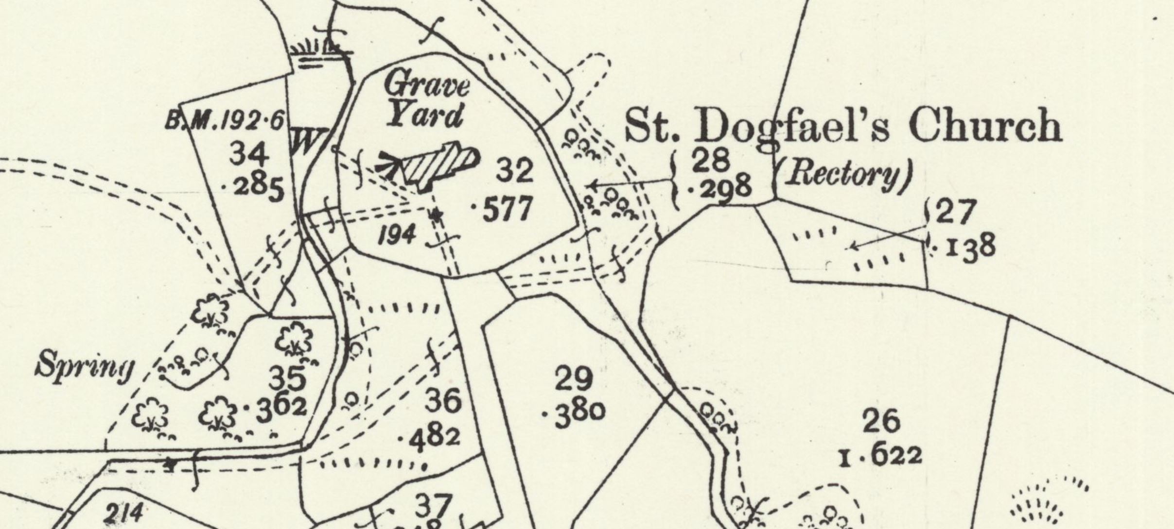 Strangely, Ordnance Survey maps have not consistently marked the spring, and its location has only been recorded on very large scale maps. Its existence was denoted by a "W", connected to the church by a small path, on the 25-inch OS map of 1907, but not on any other editions, and it is certainly not shown on modern maps. This has led to confusion as to the exact location of Ffynnon Dogfael on the Historic Environment Record, which subsequently confounds the holy well with a nondescript "spring" that was marked on all historic OS maps at SN1172938705, just under a hundred metres south west of the church. The actual holy well is located almost directly, as the Royal Commission described, on the boundary of the churchyard.