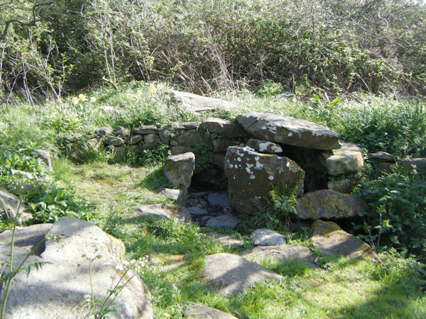Ffynnon Wnda itself is a rather mysterious holy well. For such a substantial structure that occupies such a central place in Llanwnda, it is very odd that it has gone undocumented for centuries. I have been unable to find any historical references to its existence, and the Royal Commission did not even mention the site when they visited the parish in the early 20th century, even though they described the church and several of the prehistoric monuments in the vicinity. It is only in the last few decades that the well has, effectively, appeared. The spring has clearly existed since at least the 1880s, as it has always been marked on Ordnance Survey maps, but those maps have never named the site. With all of this considered, it is quite probable that the well is not a historical holy well, but that it is a 20th century construction (built after the Royal Commission's visit to Llanwnda), modelled on the nearby prehistoric burial chambers, and built over the spring in the centre of the parish.